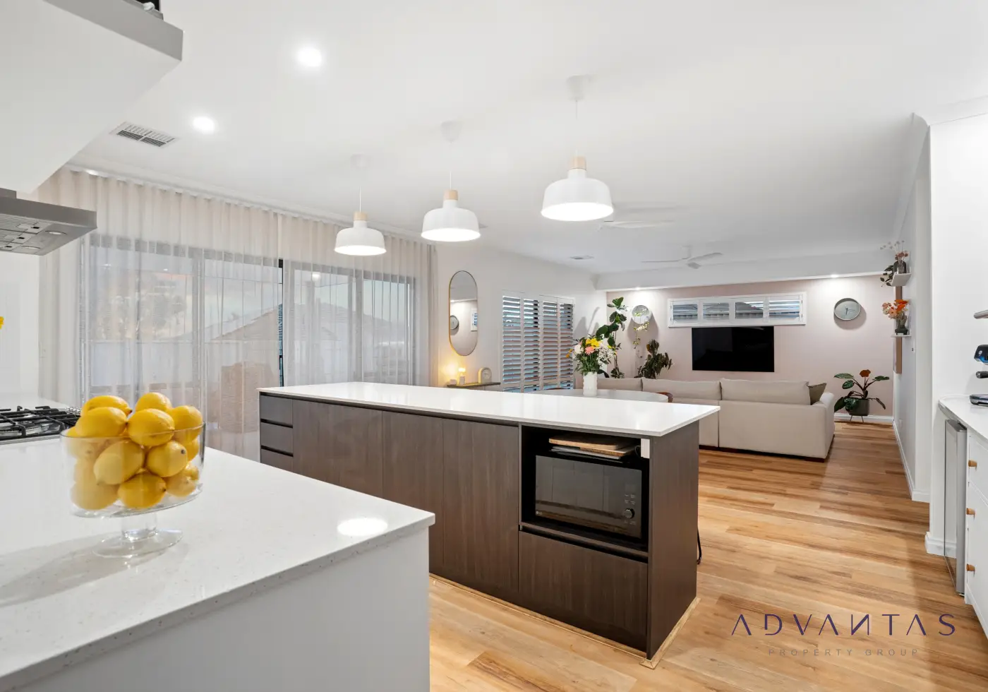 At the heart of the home is a spacious open-plan living and dining area, seamlessly connected to a chef’s kitchen fitted with top-of-the-line appliances, double ovens and quality finishes. Complementing this is a full butler’s kitchen at the rear, offering a second preparation and entertaining space — perfect for hosting on any scale without compromising on functionality or presentation.